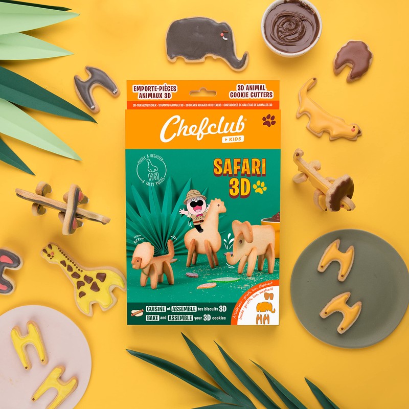 Chefclub Kids 3D Safari Cookie Cutters with Recipe - Multilingual, 8 Stainless Steel Safari Animals Cookie Cutter, Video Recipe Included for Kitchen Baking for Kids Biscuit Cutter Baking Set