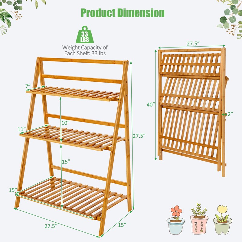 CHEFJOY Folding 3-Tier Bamboo Ladder Plant Stand, Indoor & Outdoor Flower Pot Organizer Holder w/ Stable Frame, Plant Shelf Display Rack for Balcony, Patio, Garden, Living Room