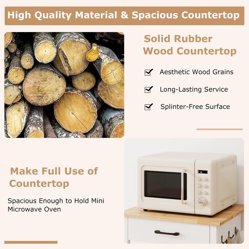 - Versatile Storage Spaces: This kitchen cart with storage offers ample room for cups, pots, tableware, wines, vegetables, and fruits, distributed across its spacious countertop, drawer, 3 side hooks, open shelf, and single door cabinet. The countertop even fits a mini microwave oven, keeping your kitchen tidy and organized.
