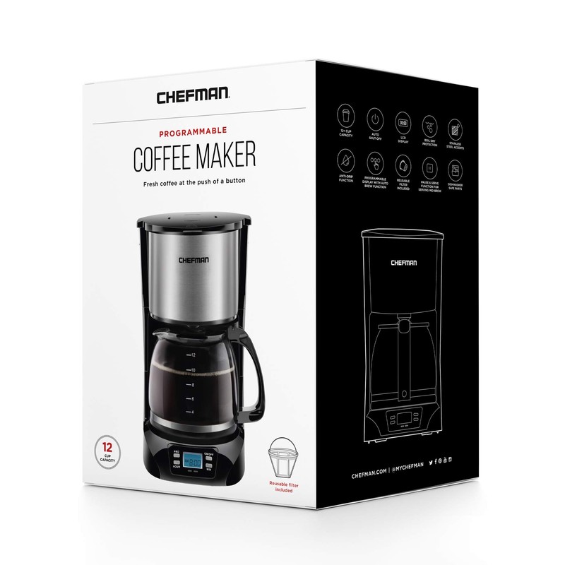 Chefman 12-Cup Programmable Coffee Maker, Electric Brewer, Auto Shut Off, LCD Display With Auto-Brew Function, Anti-Drip Pot, Reusable Filter for Fresh Grounds, Round Stainless Steel, Glass Carafe