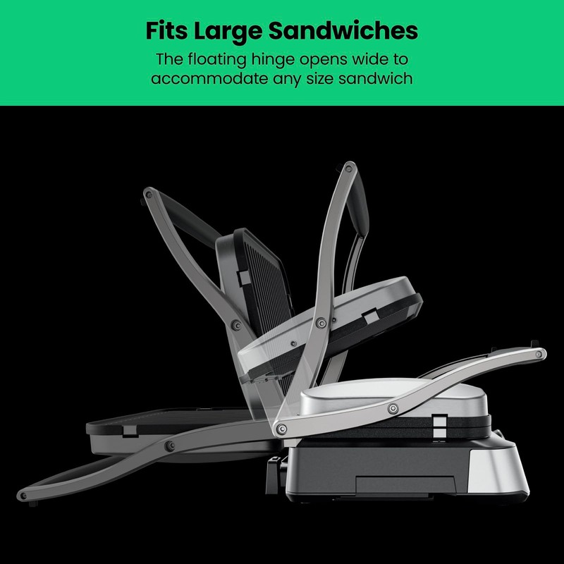 - FITS ANY SIZE SANDWICH: The adjustable hinge allows extra-large sandwiches to get evenly toasted. This panini press sandwich maker can handle it no matter how little or how much you pack in.