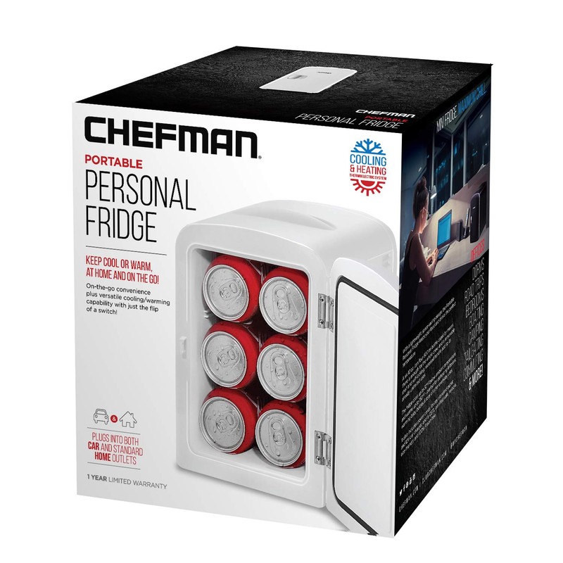 Chefman Mini Portable White Personal Fridge Cools Or Heats & Provides Compact Storage For Skincare, Snacks, Or 6 12oz Cans W/ A Lightweight 4-liter Capacity To Take On The Go