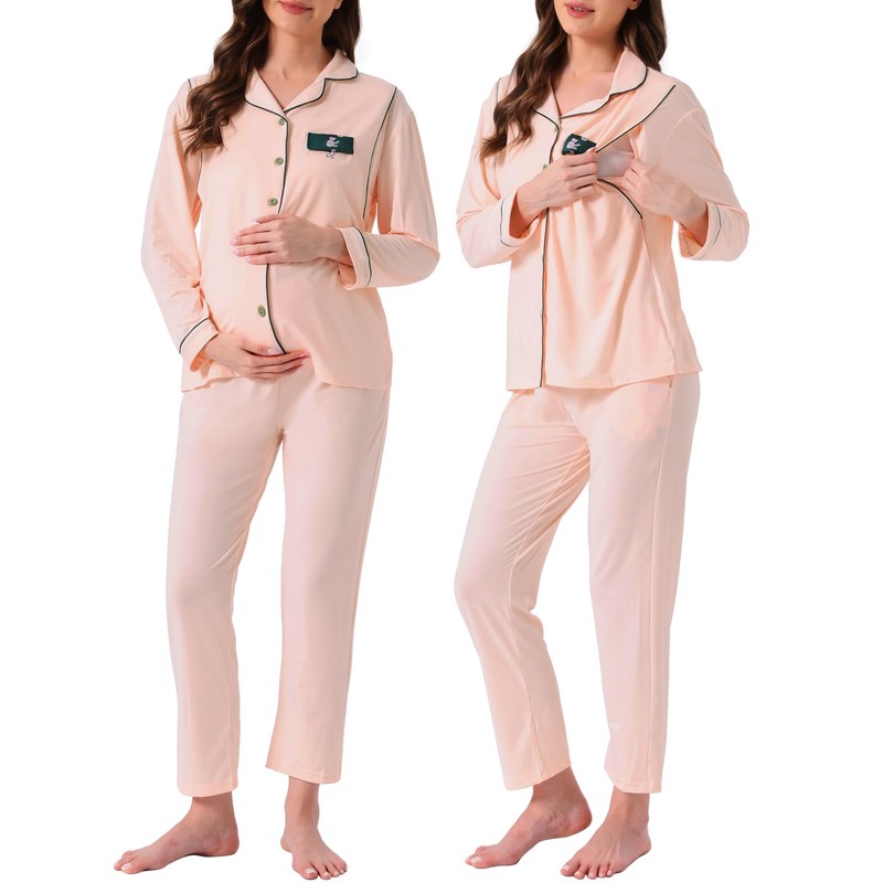 - Design: Maternity postpartum nursing pajamas crafted with contrast piping, a button-up shirt and cute print and notch collar, Pajama pants featuring an elastic adjustable waist, and Pants with Only One Side Pocket.