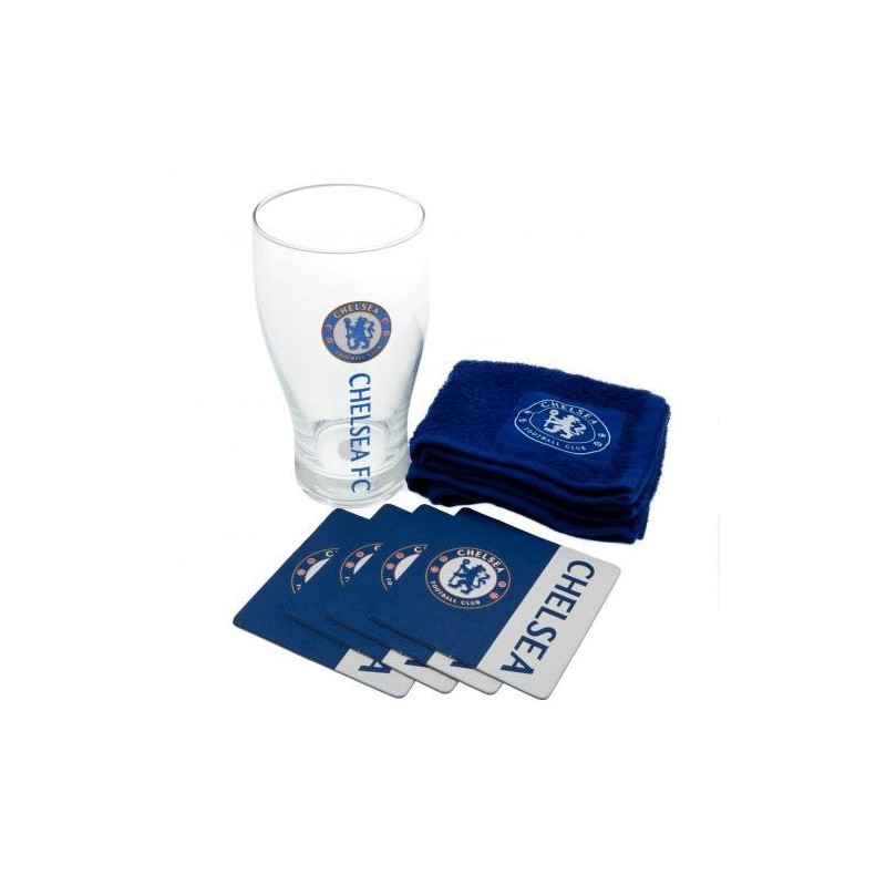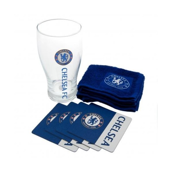 - Contains a pint glass 4 Beer mats and also has a bar towel all featuring the Chelsea club crest on the front