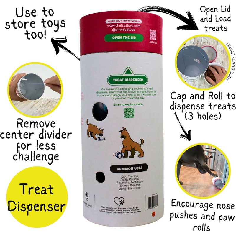 - A Treat-Dispensing Tube: The packaging transforms into an engaging treat puzzle that keeps dogs busy while rewarding their problem-solving skills. Remove the plastic insert to adjust the rate your favorite treats drop from the three punched holes.