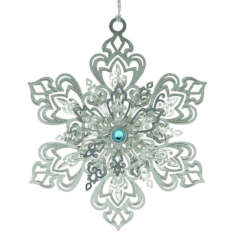 Beautifully handcrafted ornament made in the USA from solid brass, finished in imitation rhodium, adorned with a blue crystal and packaged in a gold foil window box.