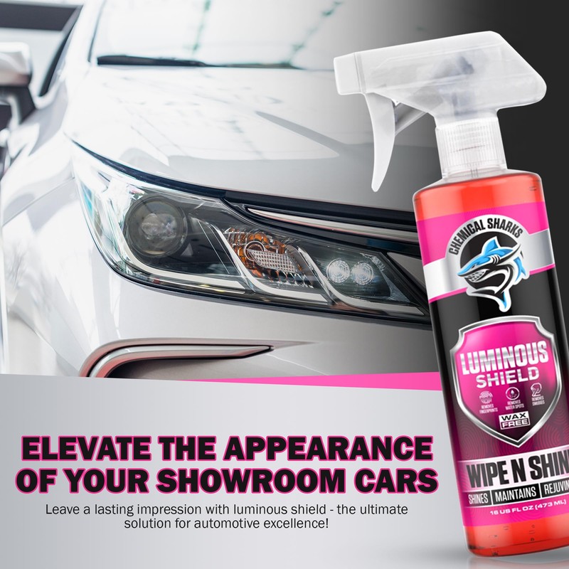 Luminous Shield by Chemical Sharks is your ultimate Wipe N Shine solution for maintaining that showroom gleam on your vehicle. Ideal for effortlessly removing fingerprints, smudges, and water spots, this premium spray rejuvenates and protects, ensuring your car always looks its best. Safe and effective on a variety of surfaces, Luminous Shield is the professional's choice for brilliant, lasting shine.