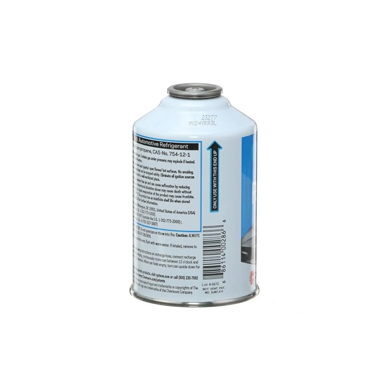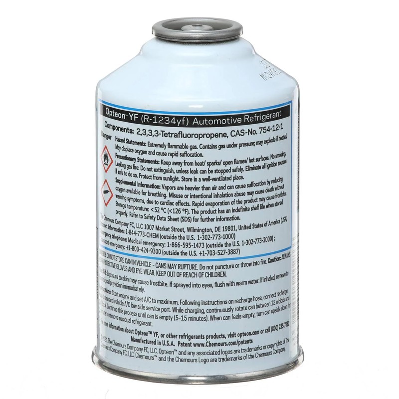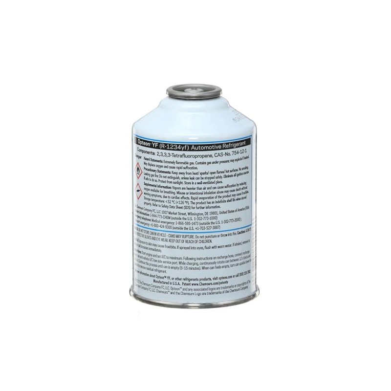 - OEM-Approved R-1234YF Refrigerant – Meets manufacturer specs for factory-installed A/C systems in 2015 and newer vehicles. 12 oz Self-Sealing Can – Compatible with standard R-1234YF recharge tools (not included). Low Global Warming Potential – Helps reduce environmental impact; EPA SNAP-compliant. Reliable Cooling Performance – Designed to restore and maintain optimal air conditioning output. Made by Chemours – A global leader in advanced refrigerant technologies.