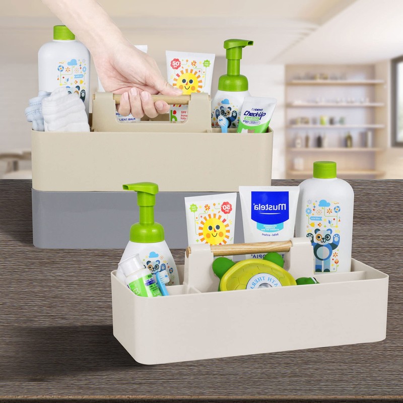 ChengFu Baby Shower Caddy Plastic Nursery Portable Storage Organizer Caddy Tote for Child/Kids, Divided Basket Bin with Wood Handle for Bathroom, Dorm Room, Holds Hand Soap, Bottles, Spoons (Beige)