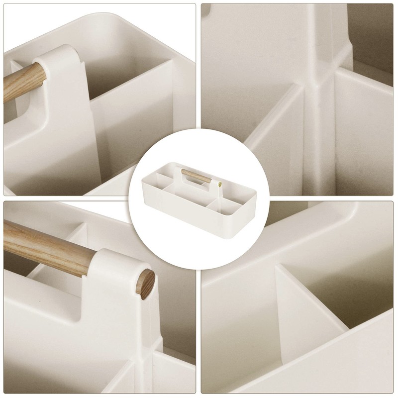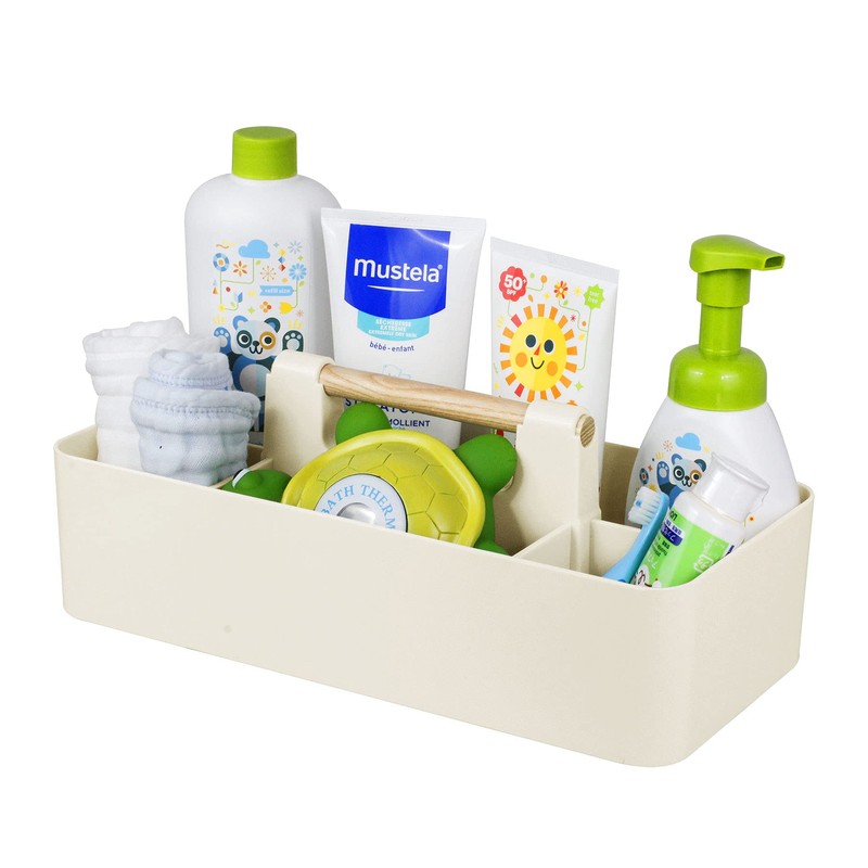 ChengFu Baby Shower Caddy Plastic Nursery Portable Storage Organizer Caddy Tote for Child/Kids, Divided Basket Bin with Wood Handle for Bathroom, Dorm Room, Holds Hand Soap, Bottles, Spoons (Beige)