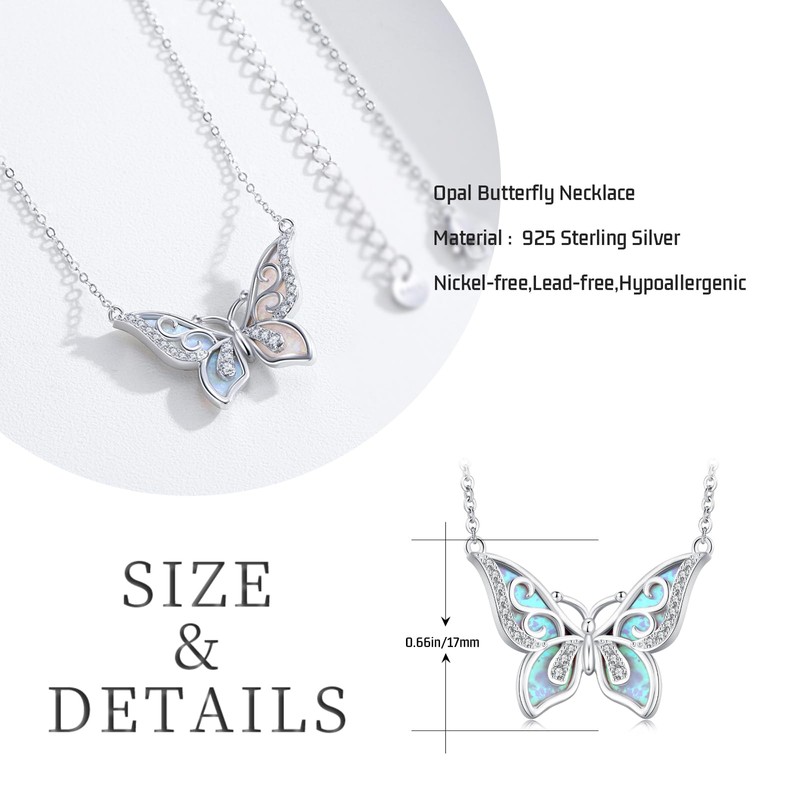 - Material of Butterfly Jewelry Gifts: The butterfly necklace made of 925 Sterling Silver, opal and 5A cubic zirconia, the "S925" stamp is engraved at the necklace. The surface of the neckalce is treated white gold plated, hard to deform,would look new even after a long time wearing.