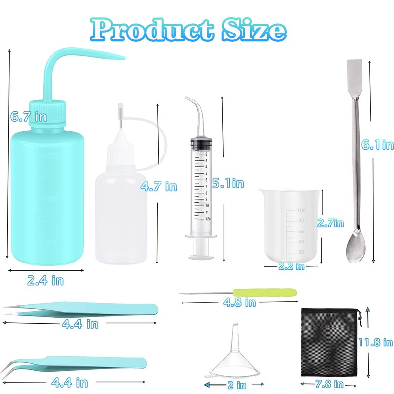 • Package Includs: You will receive 12 pcs, the package includes 1 Plastic squeeze bottle 250ml/8oz, 1 Glue bottle 100ml, 1 Plastic measuring cup 100ml, 2 Bent syringe, 1 Craft spoons, 1 x Awl, 1 Curved tweezers, 1 Tweezers straight, 2 Plastic funnels, 1 Mesh drawstring bag. NOTE: Cups are NOT included!