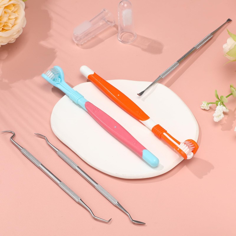 - Package includes: you will receive a dog teeth cleaning kit including 3 pieces dog tooth scalers and scrapers, 2 pieces of 3 head dog toothbrushes, and 2 pieces silicone dog finger toothbrushes, enough quantity and various tools to meet your dog's daily tooth cleaning