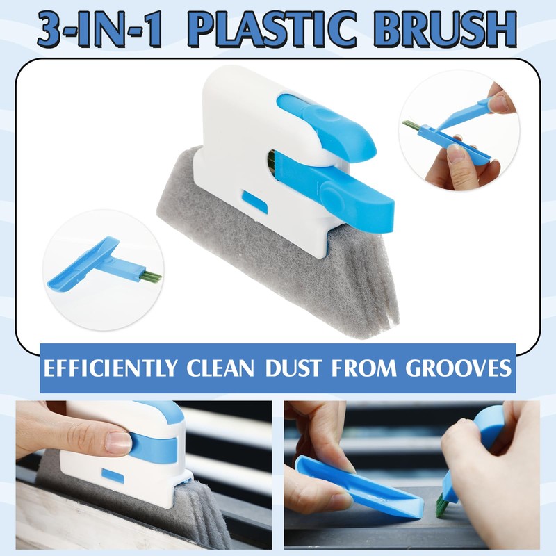 - 3-In-1 Scouring Sponge Brush: effortlessly tackle stains with the wide anti-slip handle and replaceable sponge head that boosts foam generation; The 3-in-1 design (scraper, mini brush, and bristle head) adapts to tracks, windows, and more