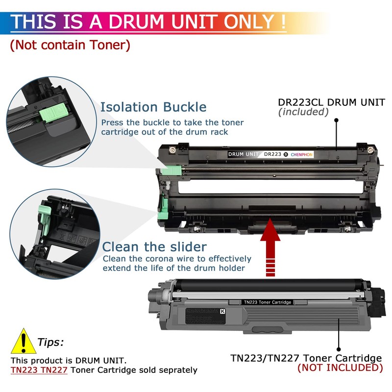 - [Replacement OEM] : Compatible for Brother DR-223CL Drum Unit. (This is DRUM unit only. Toner cartridge is not included. You need to use with TN223 or TN227 toner cartridges)
