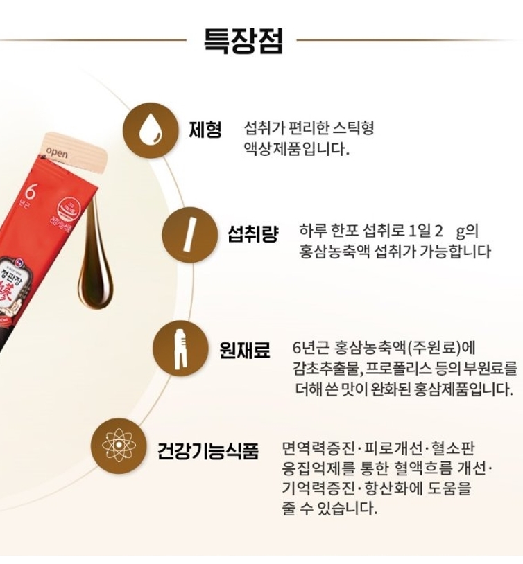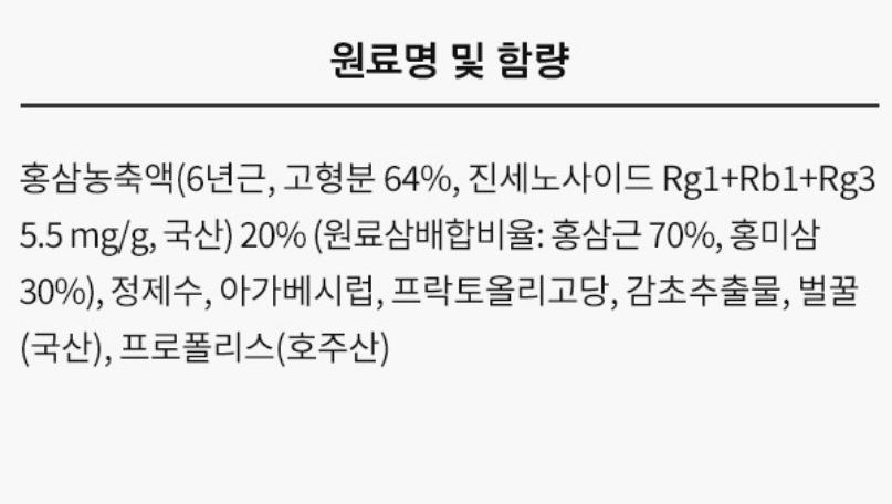 - Feature: Ingredients: Red Ginseng Concentrate (6-year-old), Purified Water, Agave Syrup, Fructooligosaccharide, Licorice Extract, Honey (Korean), Propolis (Australian)