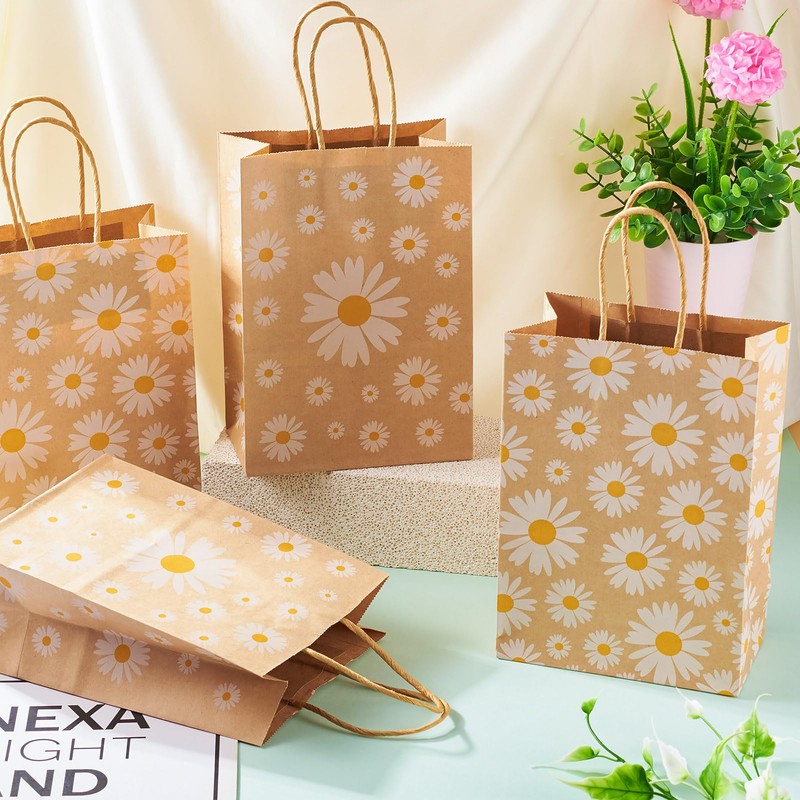 Cheriswelry 12Pcs Kraft Paper Bags Daisy Flower Paper Gift Bags Brown Shopping Bags with Handles 20.1x14.8x0.2cm for Wedding Party Favors Packaging