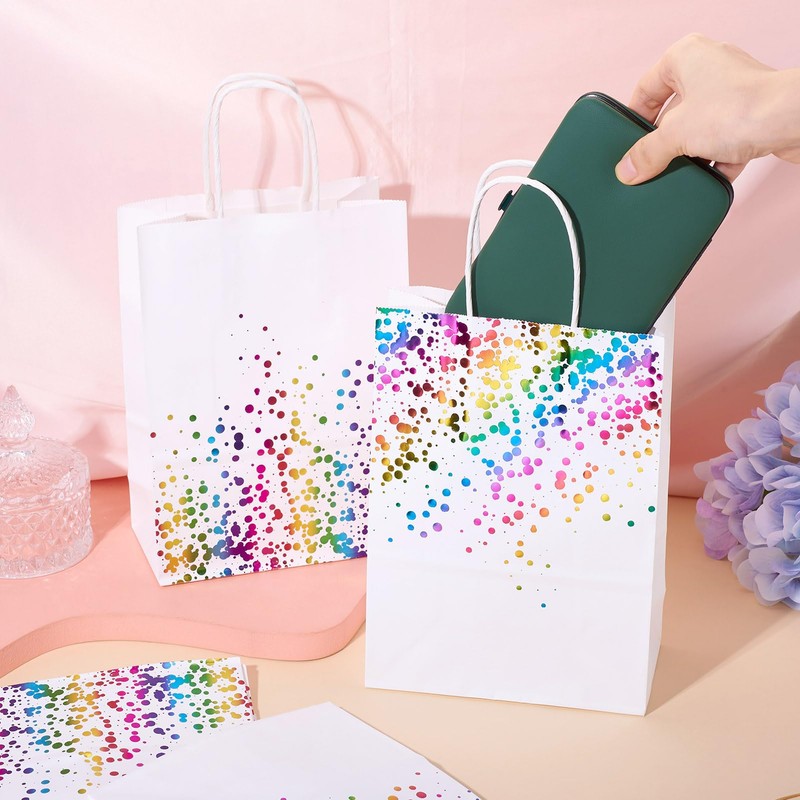 Cheriswelry 12Pcs Kraft Paper Bags Rainbow Confetti Paper Gift Bags with Handles Party Treat Bags for Birthday Wedding Christmas Holiday Favor Supplies