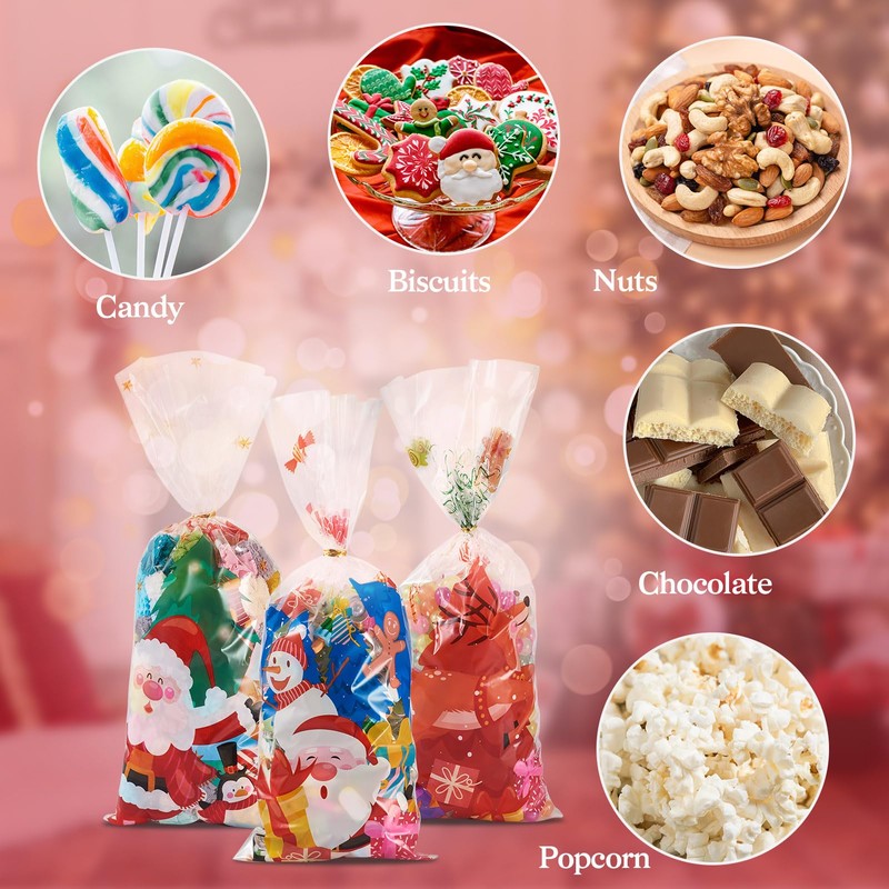 - Material: These Christmas clear candy bags are made of quality OPP, no peculiar smell, non-toxic, strong for your storage and carrying, they are a really decent size and take quite a lot of sweets.