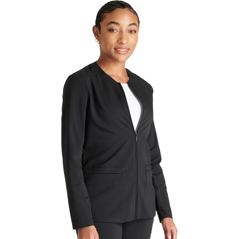 - IDEAL FOR MEDICAL PROFESSIONALS - Crafted for medical professionals and versatile for any setting, the Cherokee Atmos Zip Front Jacket offers a contemporary fit with standout features. With front yoke seams and a back waist seam with box pleats, it ensures a tailored look. Knit panels along the sleeves add comfort and style. Featuring a high-low shirttail hem, this short-length jacket boasts modern flair. Imported for quality, it's a perfect blend of functionality and fashion.