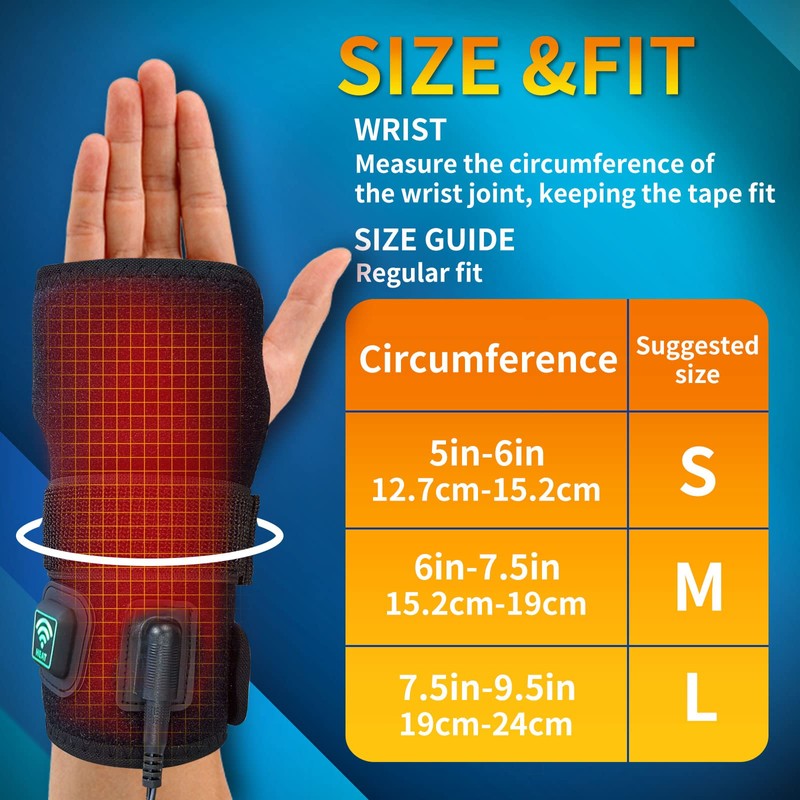 - MULTI SIZES: the wrist heating pad is customized for different adults’ wrist sizes: S fits for 5-6 inch, M for 6-7.5 inch, L for 7.5-9.5 inch. The brace is made of durable neoprene which is supportive for hand injuries. Premium quality fleece in the inner layer make a soft touch for your skin