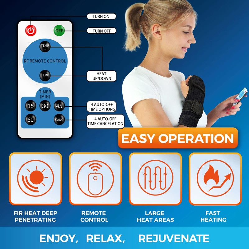 - EASY TO USE: Item supports 6 customizable heat settings and 4 auto shut off timers; Second option is by controller on the brace, long press 3 seconds to turn it on/off and short press to change heat settings