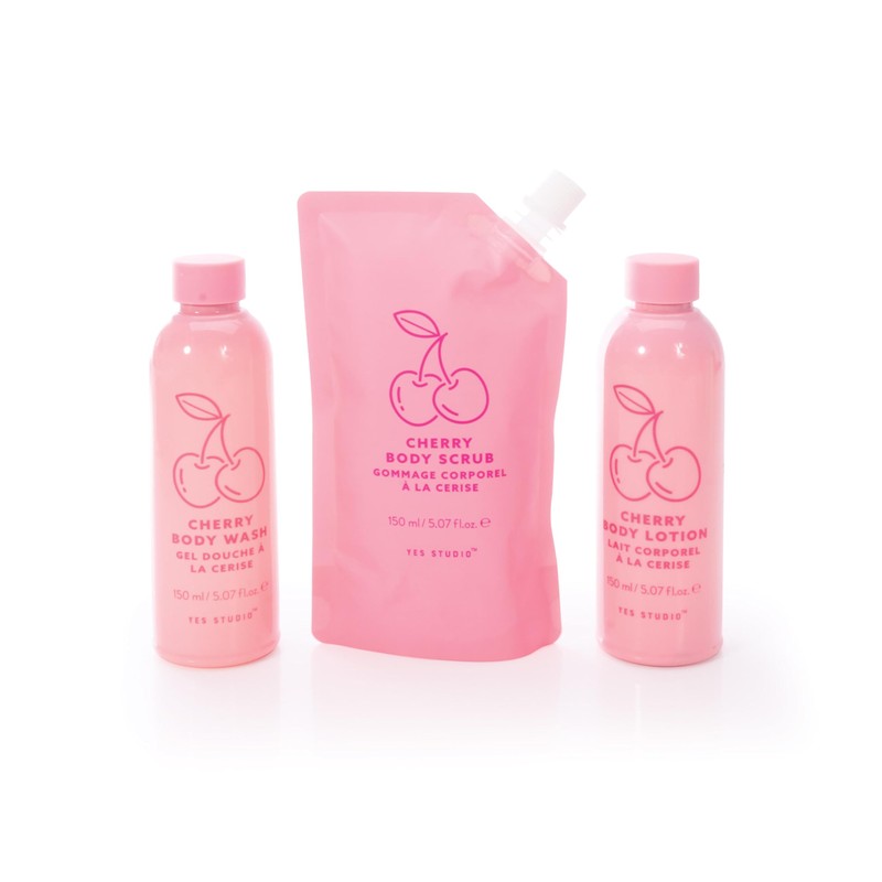 Scrub up and smell fresh with the cherry scented womens shower set from Yes Studio, with body wash, body scrub, and body lotion.