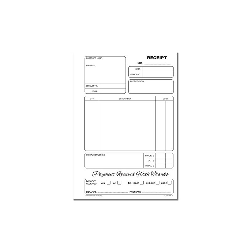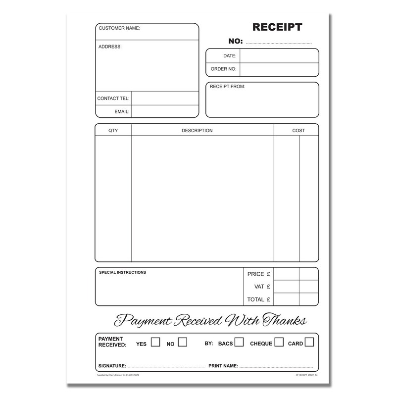 - Cash receipt duplicate book for issuing a detailed receipt to customers, whilst keeping a duplicate copy on the book. With the added information of how the payment has been made for convenience.