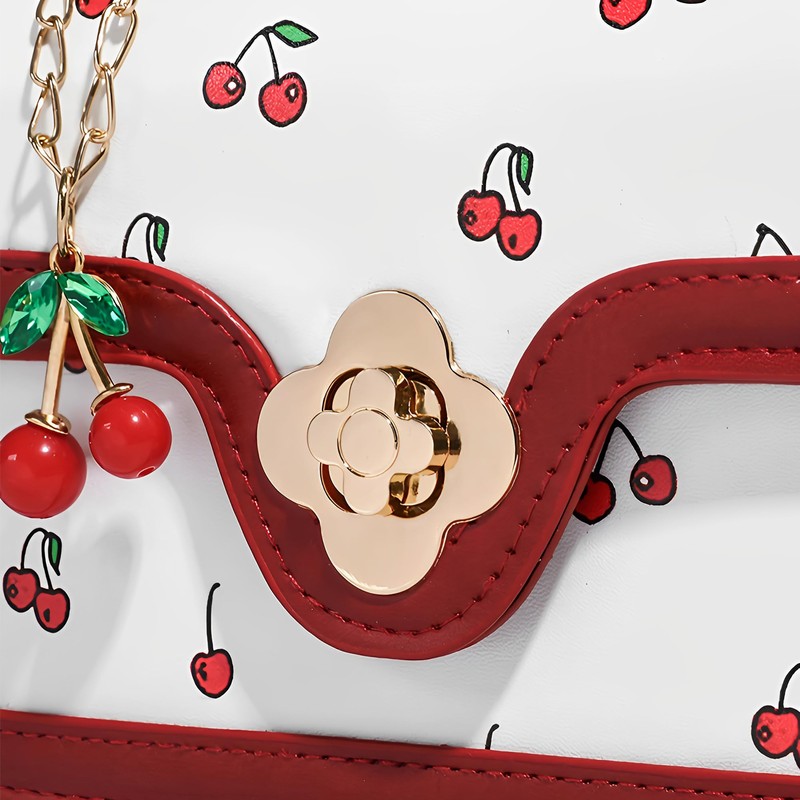 • STYLISH DETAILS: White base material with red cherry print, contrasting red handles, and metallic studs for added elegance