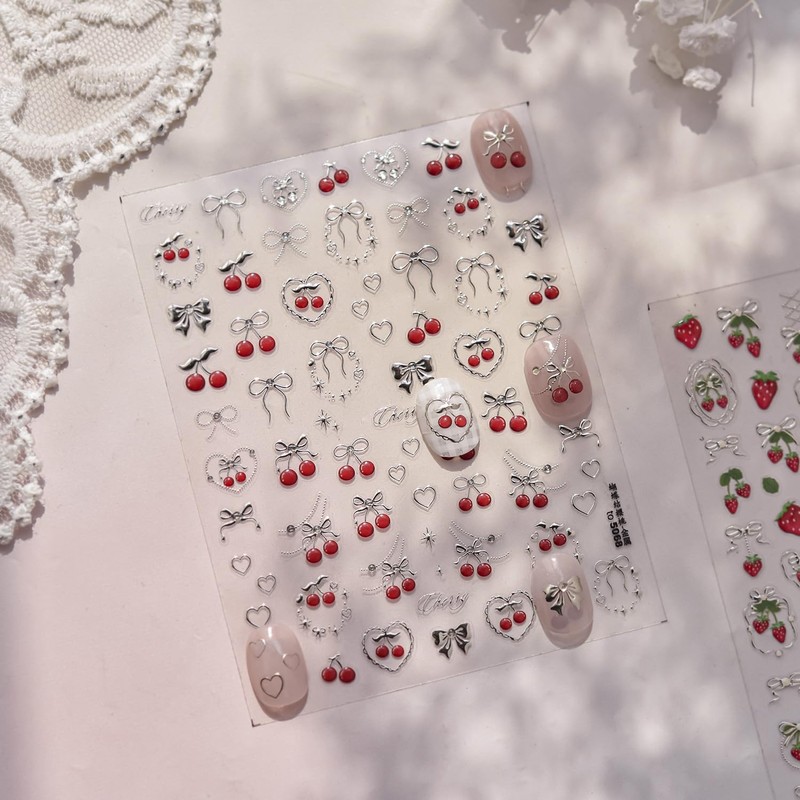 Cherry Nail Stickers Summer Nail Decals Silver Bow Nail Art Stickers 5D Embossed Bow Cherry Design Nails Adhesive Sticker Cute Fruit Nail Art Supplies Nail Charms Accessories Decorations 1PCS