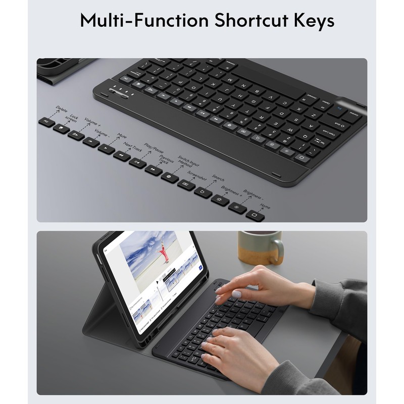 • Shortcut Keys & Stable Wireless Connection Convenient and fast wireless connection allows you to use the keyboard anywhere, anytime. And its keys are quiet and comfortable. The special designed for iPad (A16) 11th & 10th generation keyboard case comes with power-saving mode, long periods of non-use will enter the hibernation state. Keyboard with multi-function keys, such as play/pause, backward and forward, volume up and down, brightness, etc, which is convenient to use.