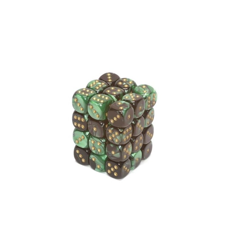 Chessex Dice d6 Sets: Gemini Black & Green with Gold - 12mm Six Sided Die (36) Block of Dice