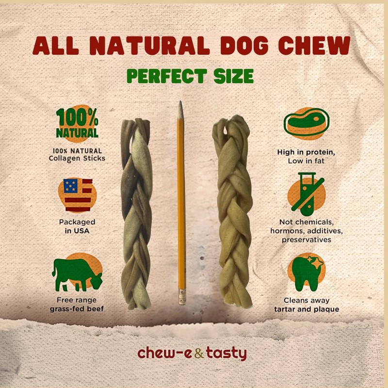 chew-e&tasty Braided Collagen Chews for Dogs (6 Inch, 10 Pack), Odor-Free, All Natural Dog Chews, Long Lasting w/Chondroitin & Glucosamine. Rawhide Alternative for Small, Medium, Large Dogs