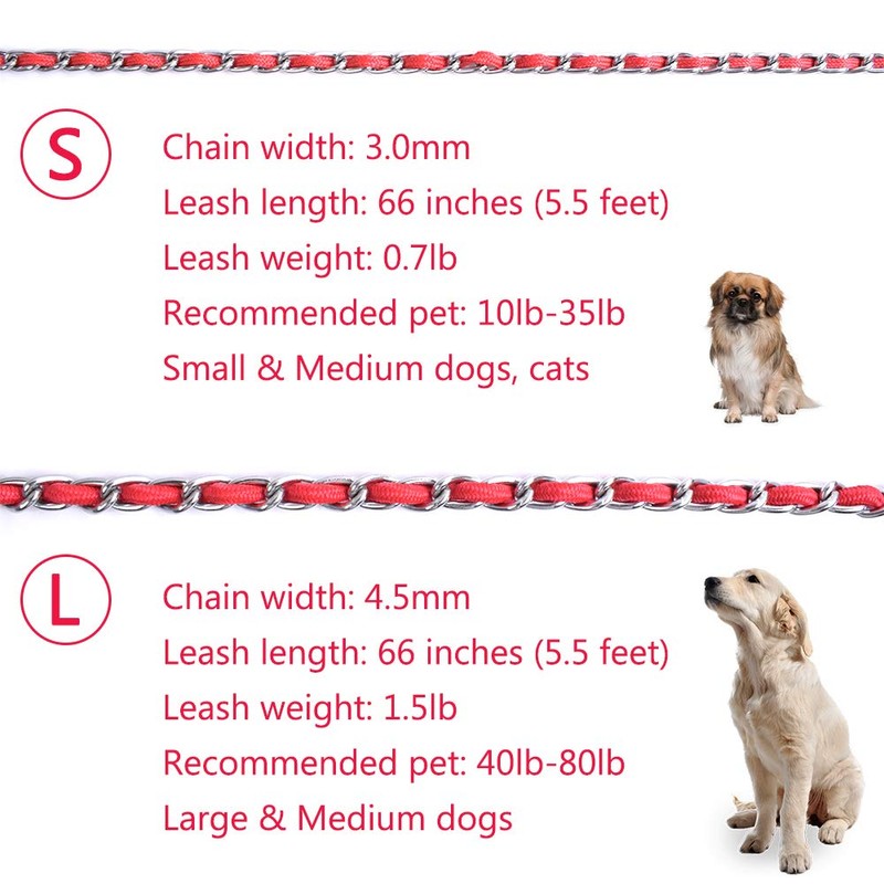 - Size - L: Width 4.5mm; Length 66inch(5.5ft). Weight 23oz. Very heavy! Only suitable for big dogs, recommended weight 40lb-80lb; S: Width 3.0mm; Length 66inch(5.5ft). Weight 11oz. Suitable for small & medium dogs, recommended weight 10lb-35lb