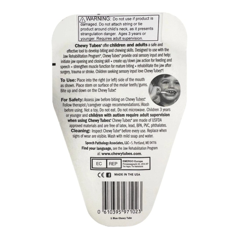 Innovative oral motor devices designed to provide a resilient, non-food, chewable surface for practicing biting and chewing skills. The Chewy Tubes can also be used with those seeking additional proprioceptive input into the jaw. Handles have corrugated ridges to assist the grasp - especially useful for those who are visually impaired. Safe, nontoxic surface is latex-free, lead-free, and does not contain PVC or phthalates.