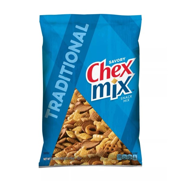 Elevate your snacking with Chex Mix Traditional Savory Snack Mix. Chex Mix snacks are delightfully savory and crunchy, with a delectably delicious blend of shapes, tastes and textures in every handful. Snack mix features: Corn Chex, Rye Chips, Bagel Chips, Windowpane Pretzels, Wheat Chex, Round Pretzels and Bread Twists. A True Snacking Classic Only Chex Mix features a blend of fun, flavorful shapes for a fantastic crunch that's anything but ordinary. The traditional savory snack mix includes two kinds of Chex cereal, two kinds of pretzels, bagel chips, rye chips and bread twists for true snacking delight. Savory Chex Mix also contains 60 percent less fat than regular potato chips, so you can snack even more joyfully. They're so flavorful, they don't need additional seasoning, so just dig in and enjoy! Chex Cereal and Pretzels Mix Chex Mix snacks are the only snacks that feature crispy, crunchy Chex cereal pieces. The Traditional Savory Snack Mix features Corn Chex and Wheat Chex, plus round and windowpane pretzels. This large 1.9 lb. bag is great for entertaining, pairing deliciously with everything from assorted nuts and spicy snack mix to finger foods.