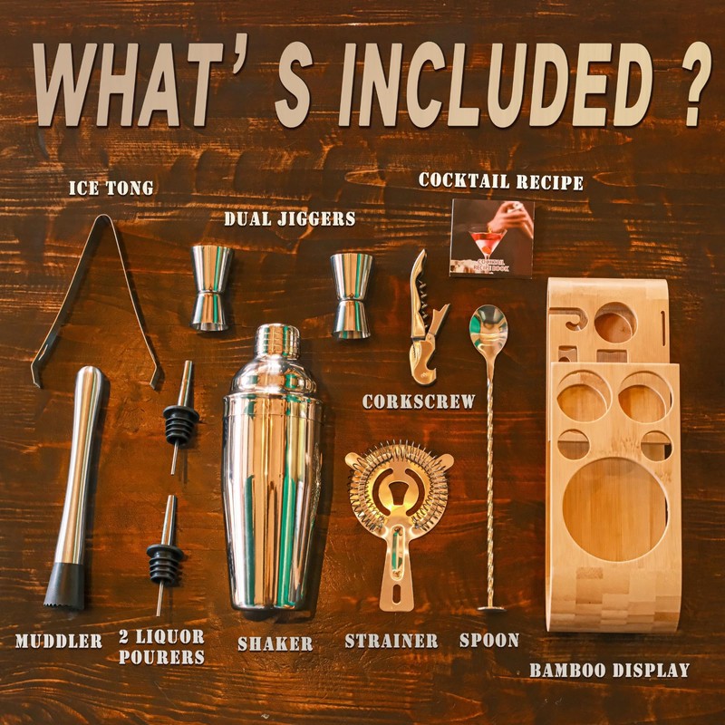 • Bartending KitOur bar mixing set come with everything you need to make the perfect cocktail. Each set comes with bamboo stand, drink shaker with a lid and filter, dual jigger for bartending, ice tong, cocktail muddler for cocktails, mixing spoon, 2 liquor pours, corkscrew, cocktail recipes, making it easy to make a variety of drinks at home or at a party.