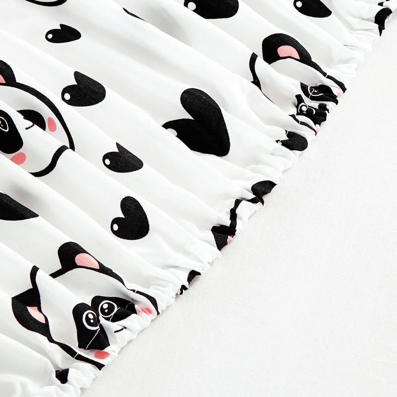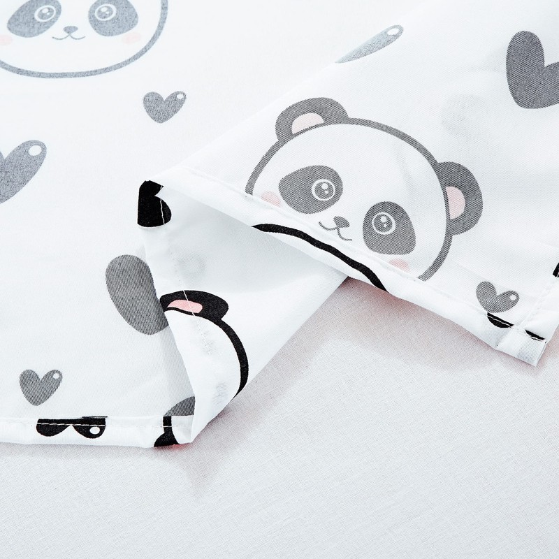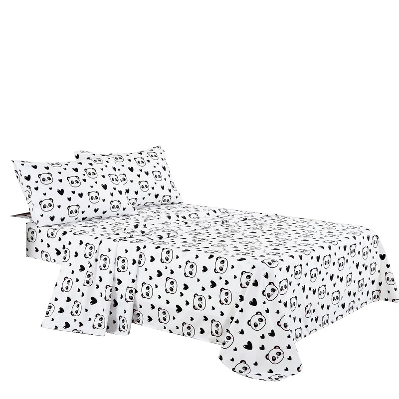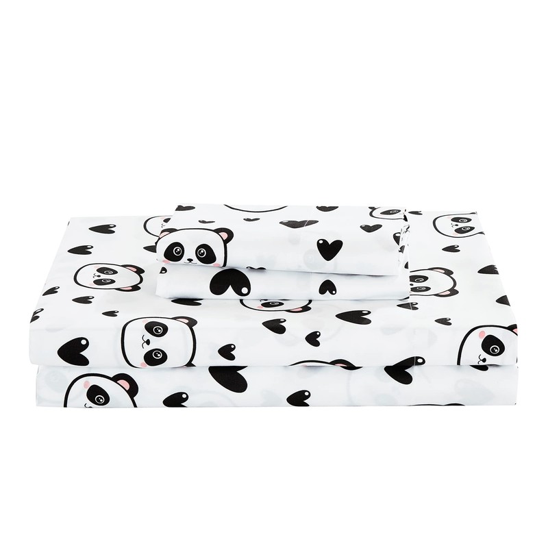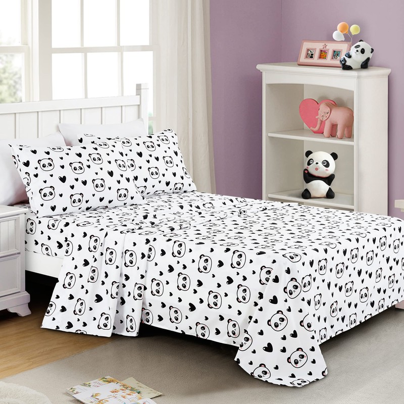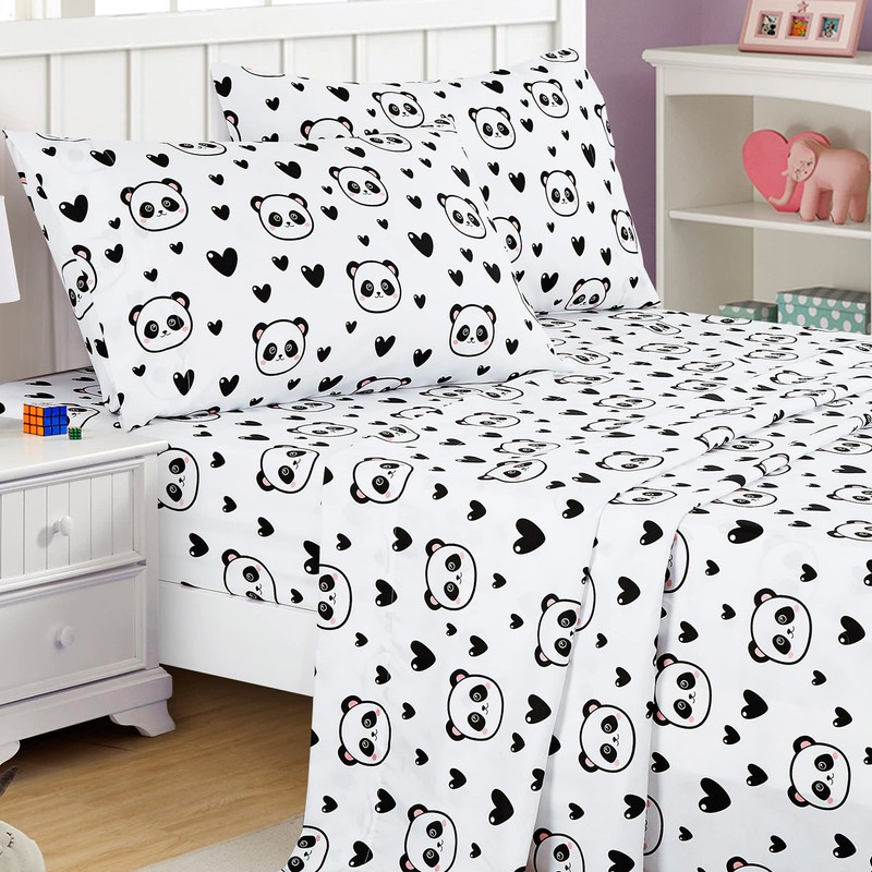 - Adorable, sweet, cuddly pandas bringing joy in your bed with love. Decorate your bed with a fun time with this eye-catching playful printed panda hearts pattern. Perfect whimsical printed sheets in a super-soft microfiber fabric to transform your kids bedroom into a bedroom haven they will absolutely love! The fitted sheets fit mattresses up to 12" with elastic all around the fitted sheet for a snug fit.