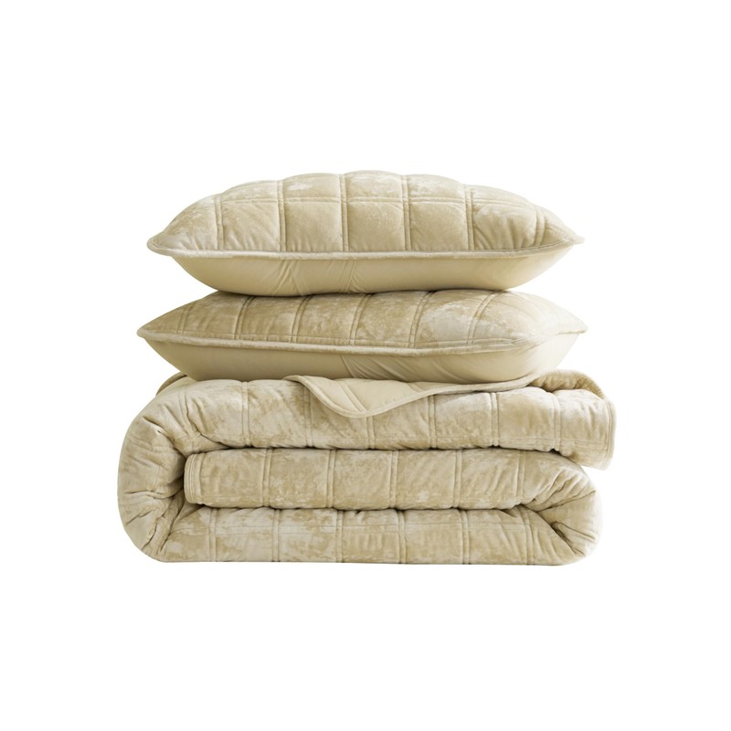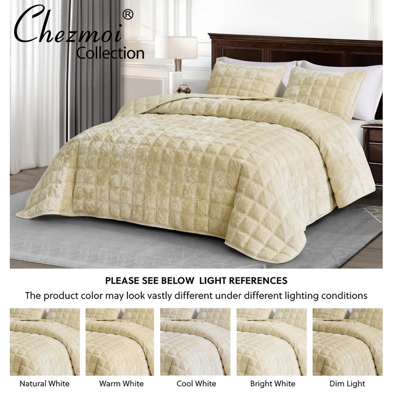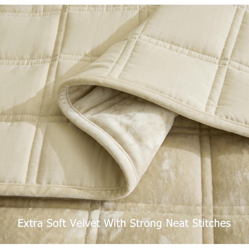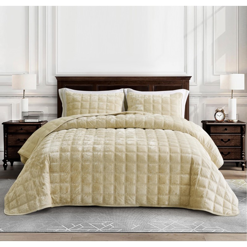 Chezmoi Collection Piers Beige Velvet Quilt Oversized King Set, 3-Piece Plush Distressed Velvet Bedding All Season Lightweight Comforter - Brushed Microfiber Reverse with Double Square Stitch