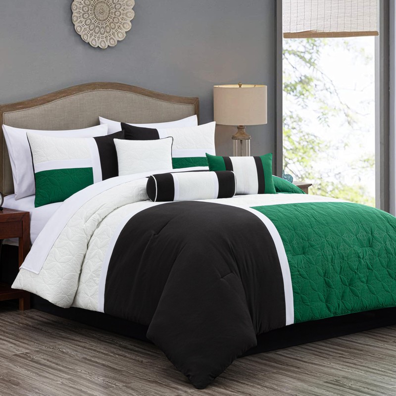 Chezmoi Collection Upland 7-Piece Quilted Patchwork Comforter Set, Green/Black/Cream White, Full