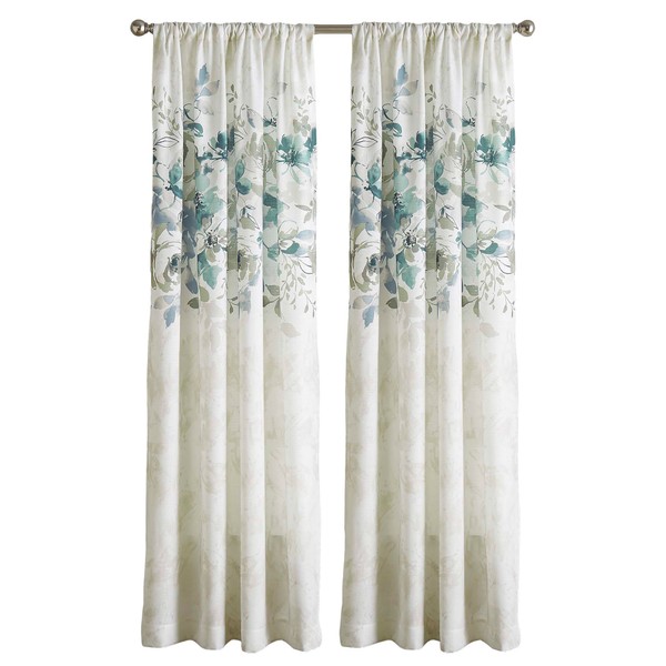 CHF Watercolor Floral Print Single Curtain Panel - Flip Over Rod Pocket Design - 50" x 84", Aqua