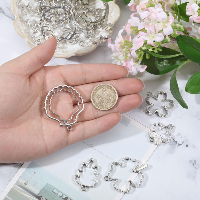 CHGCRAFT 24 Pcs 6 Style Open Bezel Pendant Leaf and Flowers Alloy Hollow Clover Frame Charms for Resin Jewellery Making DIY Earring Pendant Keychain Necklace Kit, Silver