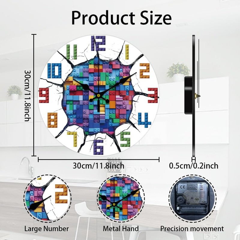- Building Blocks Theme: This wall clock is mainly based on the theme of building blocks, this beautiful patterns provides a distinctive and appealing visual element that will complement a range of domestic décor styles. Each wall clock measures 30×30cm/12×12 inch