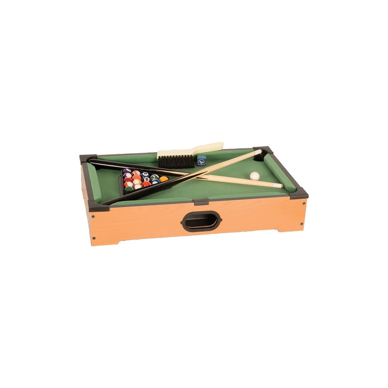 This mini pool table comes with cues, balls, triangle, chalk and felt brush. Everything you need for your own miniature pool tournament. Just plonk it on a table and you're ready to play. Miniature pool requires a smaller and more accurate discipline than you might need for a full size pool table and presents its own set of challenges. This mini pool table is practical as well as fun, since its diminutive size fits neatly into a cupboard or under most beds, making it easy to stow away for the championship celebrations. Mini Tabletop Pool Table. Includes 15 colored and numbered balls, 1 cue ball, 2 cue sticks, Chalk, Triangle rack and felt brush. Ideal for the pool shark in the house. Size: 51cm x 31cm x 9.5cm (20" x 12.2" x 3.75").