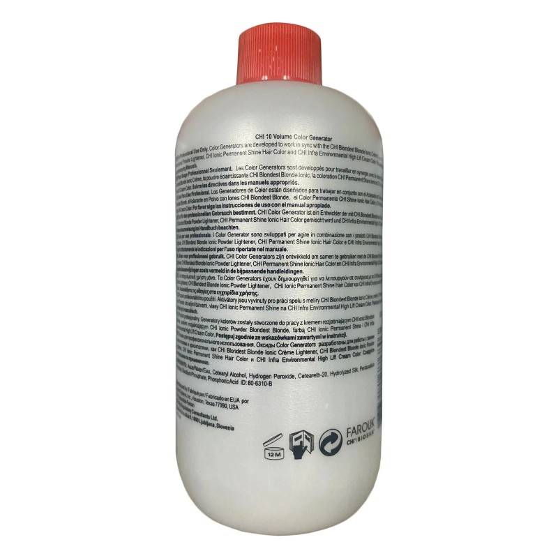 Farouk CHI Color Generator Developer 10 Volume 10 Ounce Color Generators are developed to work in sync with the CHI Blondest Blonde Ionic Crème Lightener, CHI Blondest Blonde Powder Lightener, and CHI Permanent Shine Ionic Hair Color.