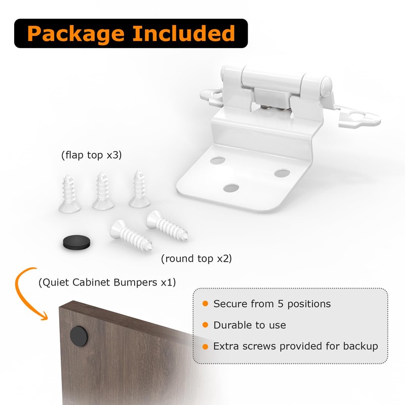 • Complete Package: Each pack includes 10 hinges (5 pairs) and 50 screws, providing everything you need for installation. The hinges close automatically within 30 degrees, and Quiet Gaskets ensure silent closure.