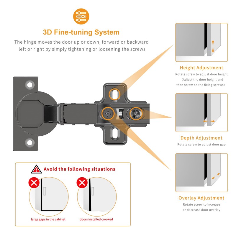 - 3D Adjustable Upgrade - Our 3D adjustable hinges allow for ultimate flexibility when it comes to customizing your cabinet doors. Adjusting your doors' vertical, horizontal, and depth positions ensures proper alignment, prevents sagging, and offers smooth opening and closing, making them a perfect fit for any cabinet style.