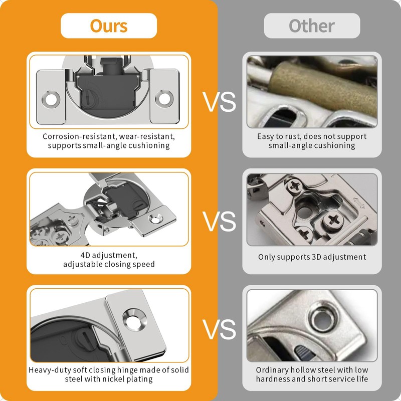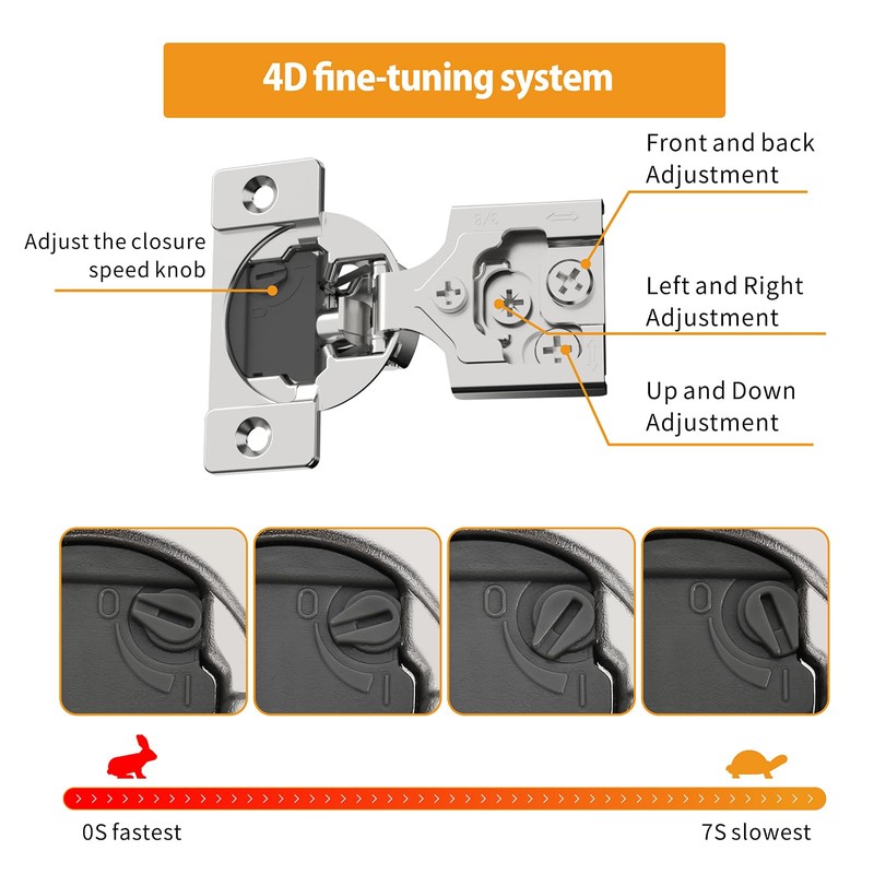 • 4D Adjustable Upgrade: 4D hinges can adjust the cabinet door just by turning a screwdriver (Vertical, Horizontal, Depth, Closing Speed), which will make sure that your new custom-made cabinet doors don't sag, align properly, and will open and close smoothly; Closing speed can be adjusted at will within 0-7s.