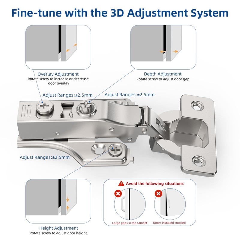 - Ultimate 3-Way Adjustability for Precision: Achieve precise alignment with advanced 3-way adjustability. Easily tweak the door's position—up, down, left, right, or back and forth—using a standard screwdriver. Eliminate sagging doors and misalignments while ensuring a smooth and seamless operation for years to come