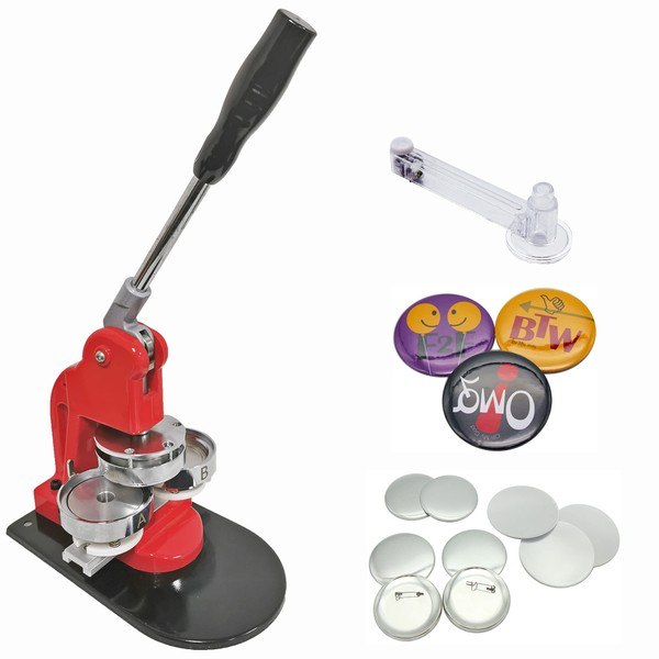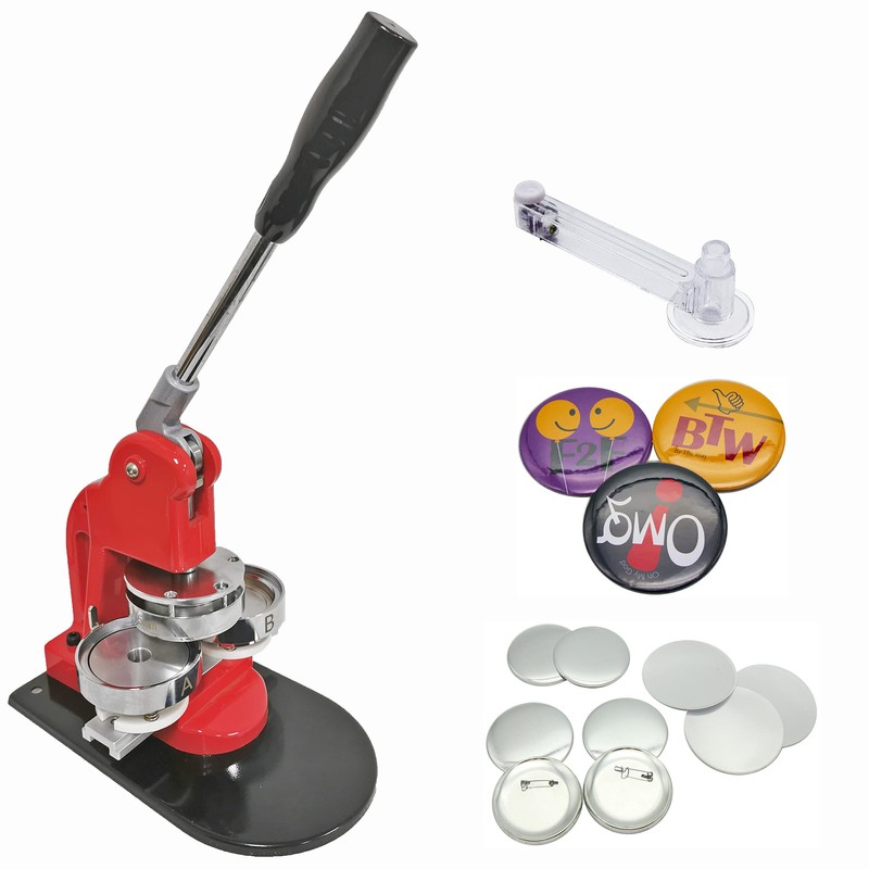 - Kit includes: Button Maker Machine Maker-1 Model + 75mm round moulds + 100 pin-back button components + adjustable circle cutter, complimentary photo paper.